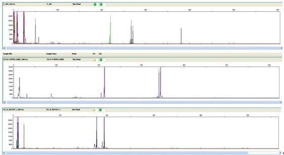 2、STR鑒定:STR(短串聯(lián)重復(fù)序列)基因分型是進行細胞交叉污染和性質(zhì)鑒定的方法之一,STR基因位點由長度為3~7個堿基對的短串連重復(fù)序列組成, 這些重復(fù)序列廣泛存在于人類基因組中,可作為高度多態(tài)性標(biāo)記,被稱為細胞的DNA指紋。STR 基因座位上的等位基因可通過擴增區(qū)域內(nèi)重復(fù)序列的拷貝數(shù)的不同來區(qū)分,在毛細管電泳分離之后可通過熒光檢測來識別。隨后通過一定的計算方法,即可根據(jù)所得的STR分型結(jié)果與細胞STR數(shù)據(jù)庫比對從而推算出樣品所屬的細胞系或可能的交叉污染的細胞系名稱。